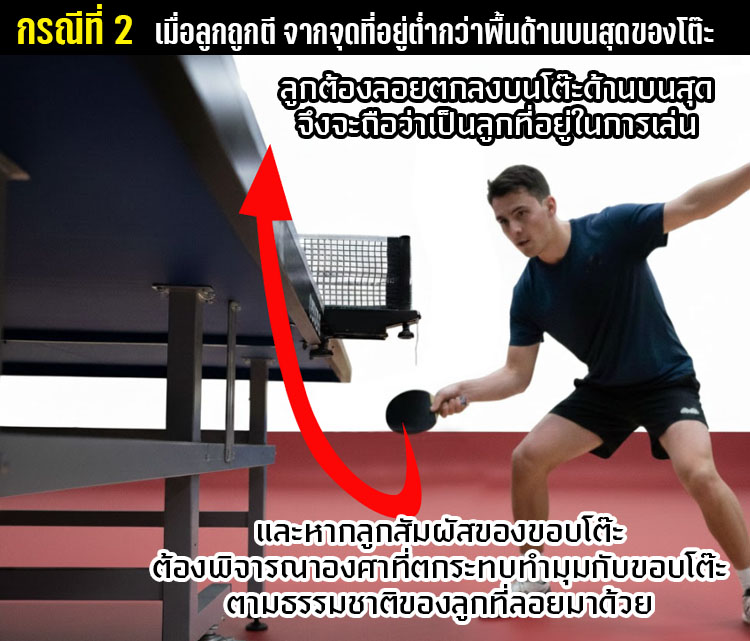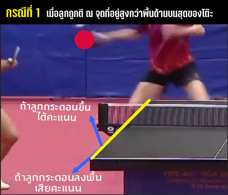 กรณีนี้ ถ้าจะให้ละเอียดยิ่งขึ้นยังจะต้องดูตำแหน่งที่ผู้ตีลูก  ตีอีกว่า ตีในขณะที่ลูกลอยอยู่เหนือพื้นหน้าโต๊ะ หรือ ขณะที่ลูกลอยต่ำกว่าหน้าโต๊ะปิงปองอีก โดยแบ่งออกเป็น 2 กรณีตามรูปนี้ครับ...