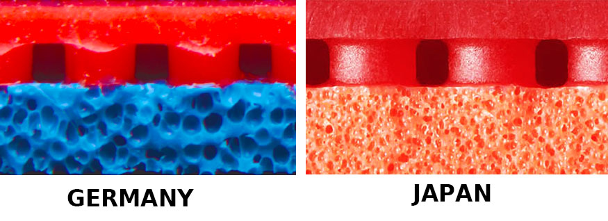 เราจะเห็นได้ว่าในระยะเวลาประมาณ 10 กว่าปีที่ผ่านมา  ค่ายทางญี่ปุ่น และ เยอรมัน มีการแข่งในการคิดค้นกันสูงมาก  เริ่มต้นจากการพัฒนาด้านโครงสร้างของฟองน้ำ ซึ่งฟองน้ำของยางปิงปองจะมีผลต่อความเร็วหรือความเด้งของยางปิงปองสูงมาก  และเราก็ได้เห็นฟองน้ำแบบรูพรุน ต่างๆ นำมาใช้ในยางปิงปองของค่ายเยอรมันและญี่ปุ่น ซึ่งก็ให้ความเร็วกับลูกปิงปองเพิ่มขึ้นได้เห็นอย่างชัดเจน  แต่เราจะไม่เห็นทางค่ายผลิตยางจากจีนที่จะพัฒนาความเด้งของยางจีน อาจจะเป็นเพราะจีนเป็นแชมป์ระดับสูงๆ มากมาย จึงไม่ได้ให้ความสำคัญกับการพัฒนายางปิงปองเหมือนค่ายเยอรมันและญี่ปุ่นสักเท่าไหร่ แต่ก็มีแบรนด์ที่เน้นส่งออกก็จะนำฟองน้ำแบบพรุนมาใส่ในบางรุ่นเพื่อเป็นอีกหนึ่งทางเลือกให้กับนักกีฬา